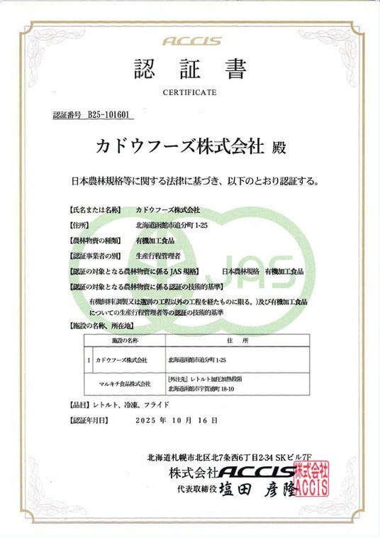 カドウフーズ株式会社(本社:北海道函館市追分町1-25、代表取締役:嘉堂 聖也)は、この度、【有機加工食品】の認証(有機JAS認証)を取得いたしました。これを機に、これまで非有機野菜で培ってきた規格外品を活用するノウハウを、需要が高まる有機野菜にも展開し、農家様の六次化支援とフードロス問題の解決に一層注力してまいります。