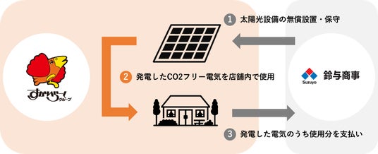 この取り組みをさらに推進するため、すかいらーくHDは、鈴与商事の提供するオンサイトPPAサービスによる太陽光発電設備の導入を決定いたしました。まずは3店舗(バーミヤン甲府下飯田店、バーミヤン三郷戸ヶ崎店、バーミヤン宇都宮徳次郎店)への導入を行い、他店舗への導入も進めていく予定です。 鈴与商事とすかいらーくHDは、本取り組みを通じ、脱炭素社会の実現に向けた再生可能エネルギーの普及を推進してまいります。