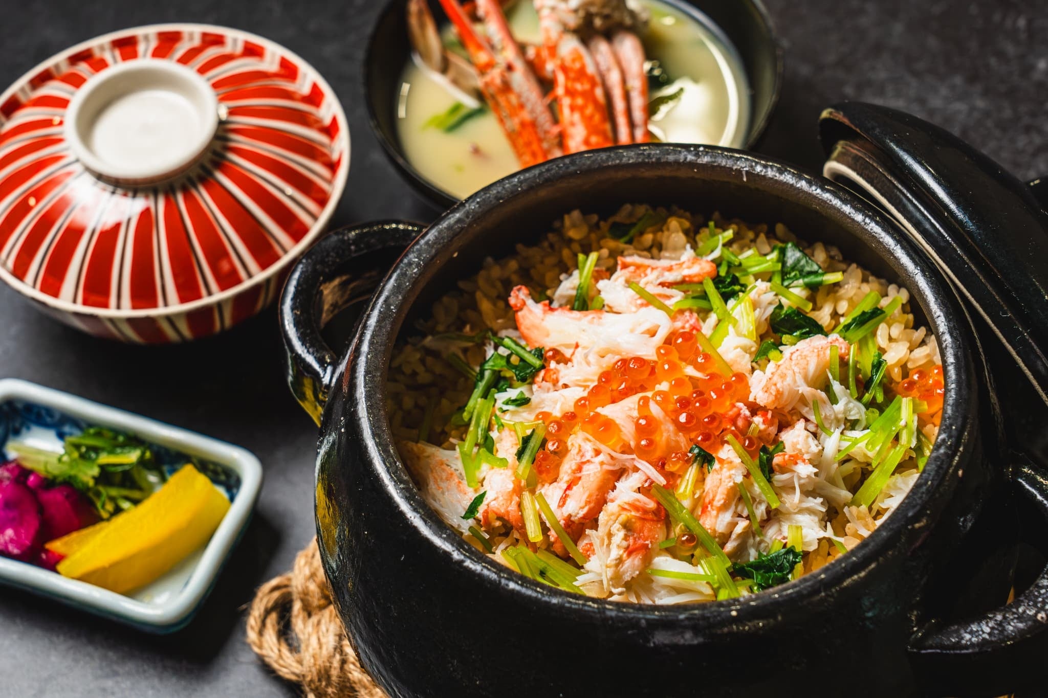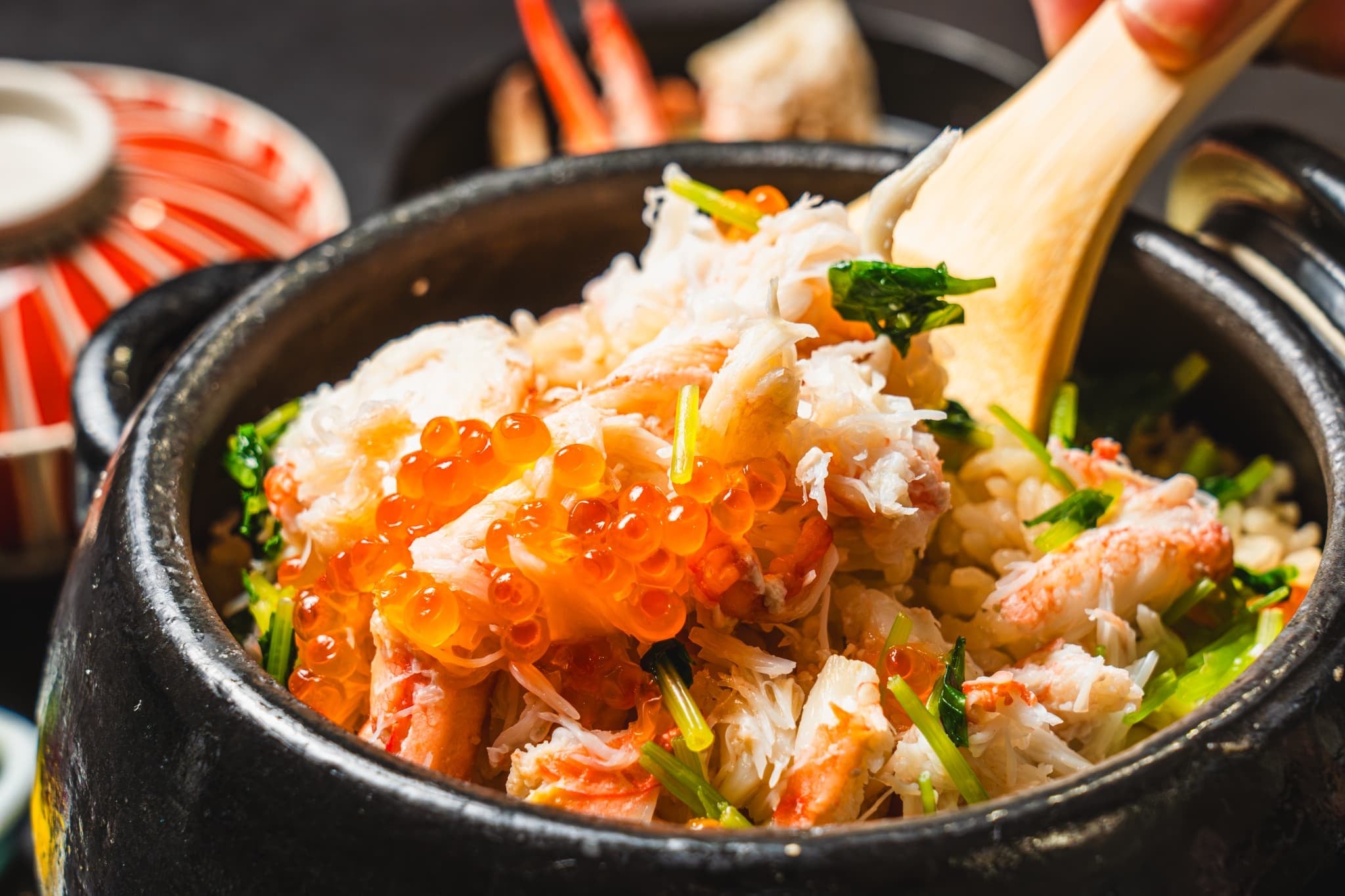仕上げの主役は蟹とイクラの贅沢土鍋ご飯