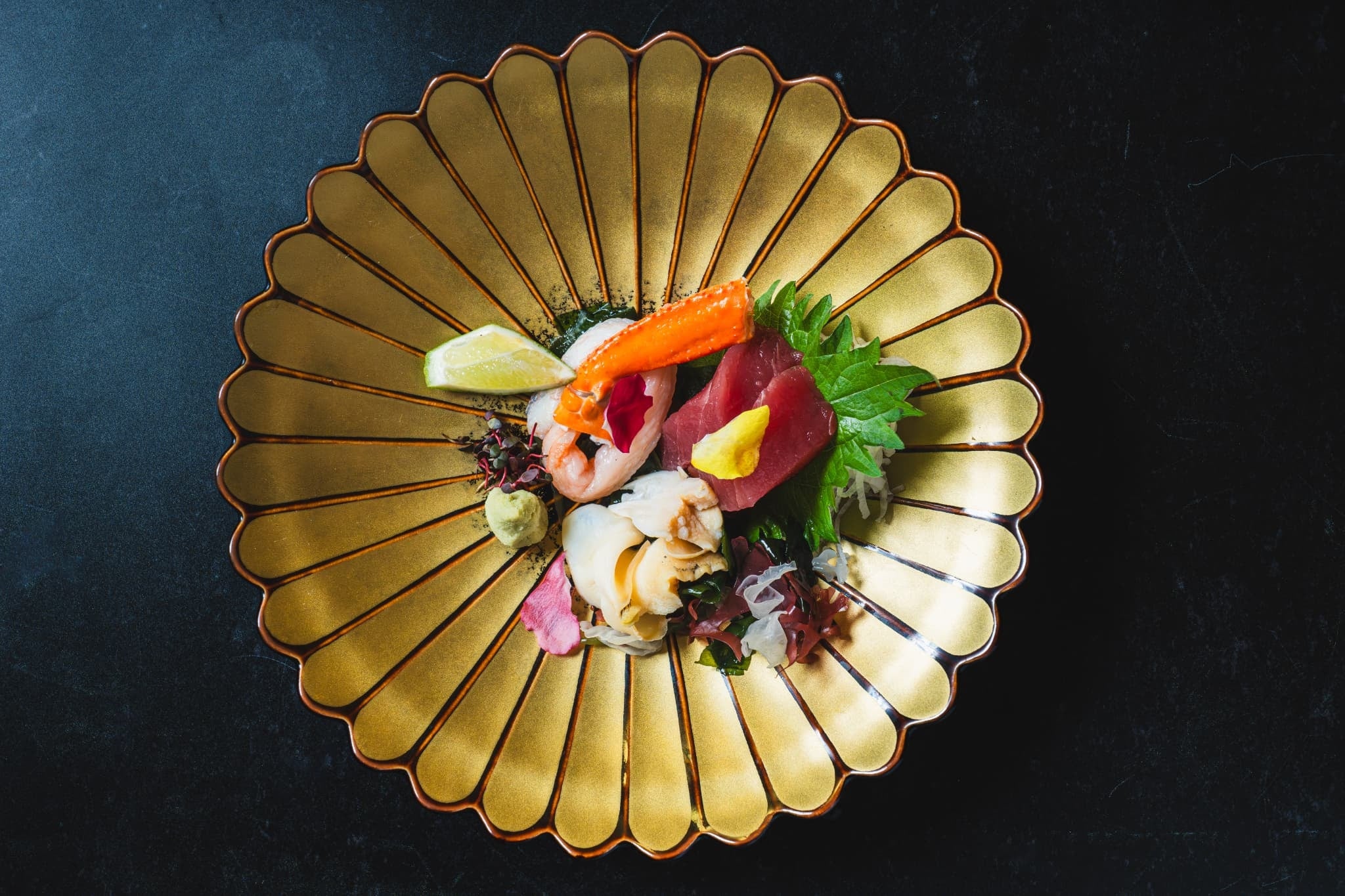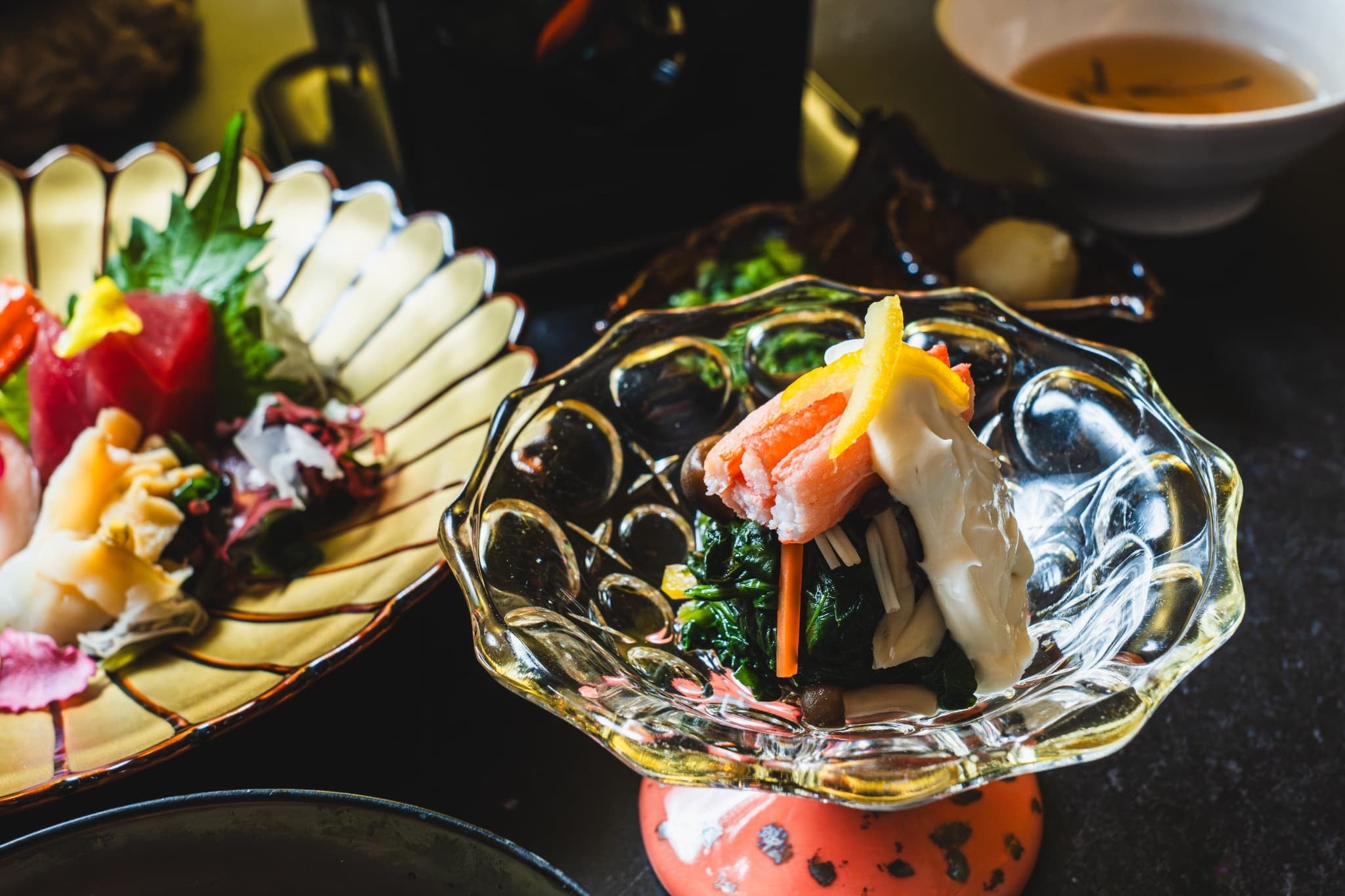 続くお造りでは、みずみずしいズワイ蟹に粒貝と鮪を添え、味わいに奥行きを持たせました。