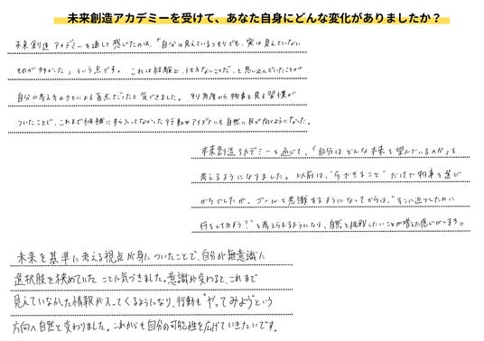 未来創造アカデミーで生まれる変化は、社員一人ひとりが 「自分にはもっと可能性がある」と感じられるようになることです。自分の認知のクセに気づき、望む未来を基準にものごとを見られるようになると、これまで見えていなかった選択肢に気づけるようになり、日々の行動や自信にも変化が生まれます。