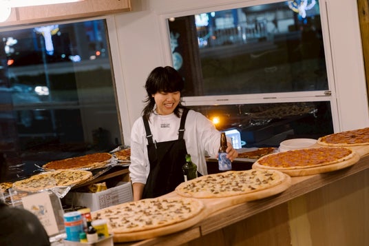 提供するのは、ニューヨークスタイルのピザ。直径約50cmの大きなピザを、ワンスライスから気軽に楽しめるスタイルで提供します。