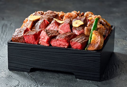 北海道産和牛モモやサロマ和牛のすき焼きをふんだんに盛り付けた贅沢なメガ盛り弁当です。