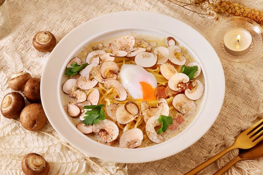 とろりとした半熟卵を絡めれば、マッシュルームの旨みとベーコンのコクが重なり合い、