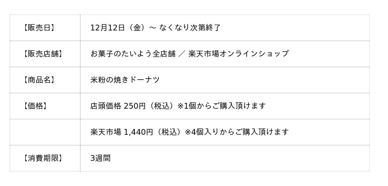 株式会社太陽社(所在地:千葉県匝瑳市飯倉293、代表取締役:片岡正裕)が展開する千葉県で長年愛される菓子店「お菓子のたいよう」は、「小さなお子様から美容・健康意識の高い大人まで、誰もが安心して楽しめる」をコンセプトに、千葉県産米粉100%を使用したグルテンフリーの「揚げない焼きドーナツ」を、12月12日(金)より発売いたします。