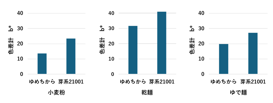 - 日清製粉および日清製粉ウェルナにおける加工適性評価試験の結果、「芽系21001」を原料とした小麦粉で製造したパスタは、強い生地感とパスタらしいプリっとした食感を持ち、濃い黄色み(図2、3)を呈し、デュラム小麦で作られた乾燥パスタに近い品質であることが確認されました。