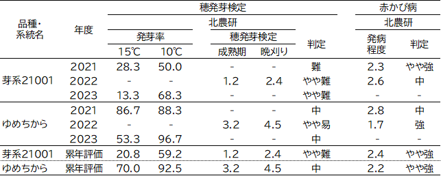 表1.「芽系21001」の穂発芽耐性および赤かび抵抗性