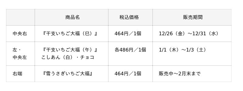 そのほか、赤い目と羊羹で作った耳が愛らしい『雪うさぎいちご大福』など、年末年始に特別ないちご大福が続々と登場いたします。