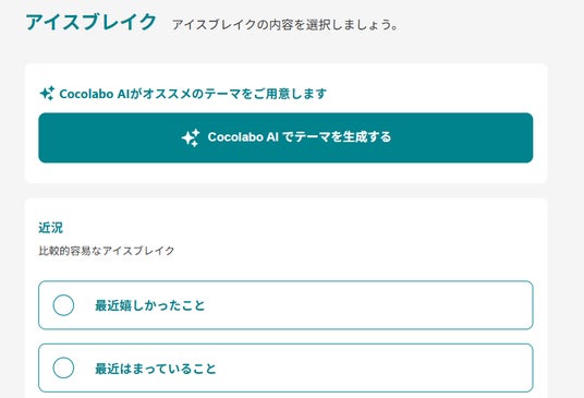 エンゲージメント向上を軸とした組織開発・人材育成コンサルティング支援を通して“推せる職場づくり”を進める株式会社NEWONE(本社:東京都港区 代表取締役:上林 周平、https://new-one.co.jp/ 以下、NEWONE)は、チームビルディングプラットフォーム「Cocolabo」において、季節や時期に合わせたアイスブレイクのテーマをAIが自動で提案する新機能を追加しました。