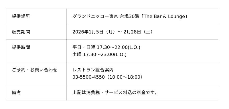 「東京を楽しむ 東京をくつろぐ」ひとときをお届けするグランドニッコー東京 台場(住所:東京都港区 総支配人:塚田 忠保)は、ホテル最上階から東京の夜景を一望できる「The Bar & Lounge」にて、冬の果実が演出するエレガントな一品『大人のいちごパフェ』と、旬のあまおうを贅沢に使用した『Strawberry Cocktail Selection』を、2026年1月5日(月)~2月28日(土)の期間限定で提供いたします。