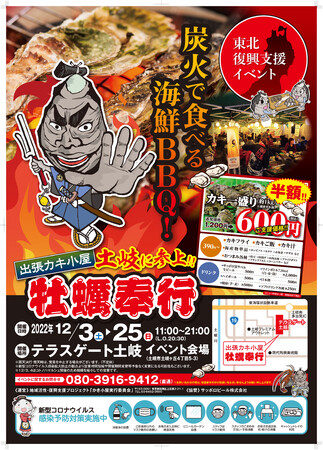 宮城県石巻の牡蠣をセルフ炭火焼き(海鮮BBQ)で楽しむ「出張カキ小屋 牡蠣(かき)奉行」(TEL 080-3916-9412)が12月5日、テラスゲート土岐(まちゆい、よりみち温泉敷地内、岐阜県土岐市)に期間限定オープン。期間は12月5日~12月25日。