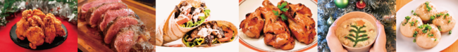 【大分聖地中津からあげ ぶんごや】特製クリスマスチキン(骨付き骨なしMIX)/特製骨付きヤンニョムチキン、【餃子の宮でんでん】小江戸川越焼き小籠包、【The 3rd. Shibuya】クリスマス限定!旨だれローストチキン、【The Kebab Factry】ビーフケバブラップ/シュラスコステーキ ほか