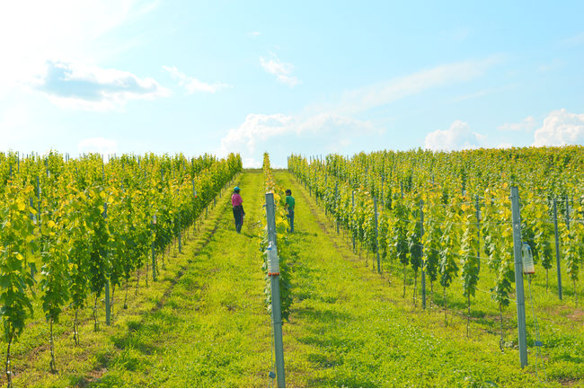 自社農園(八雲ヴィンヤード)は風通しがよく、南向きの傾斜地で水はけのよい粘土質土壌。化学肥料・除草剤不使用の草生栽培と細やかな栽培管理による減農薬栽培(リュット・レゾネ)を実践。最低限の防除のみに抑えて、あとは有機農法で対応し、ぶどうが自ら生きようとする環境を整えて健全でパワフルなぶどうに育てています。細かな作業ひとつひとつを、スタッフひとりひとりがスペシャリストとして丁寧に行い、みんなで本当においしいワインを造る、実直なワイン造りを実践しています。