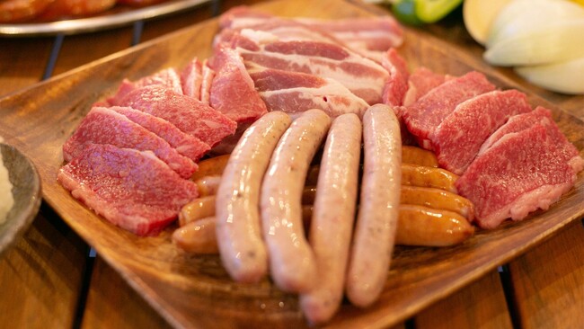 BBQには、牛、豚、ウインナーの盛り合わせをご用意! その他、サラダやデザートもプランに付いています。