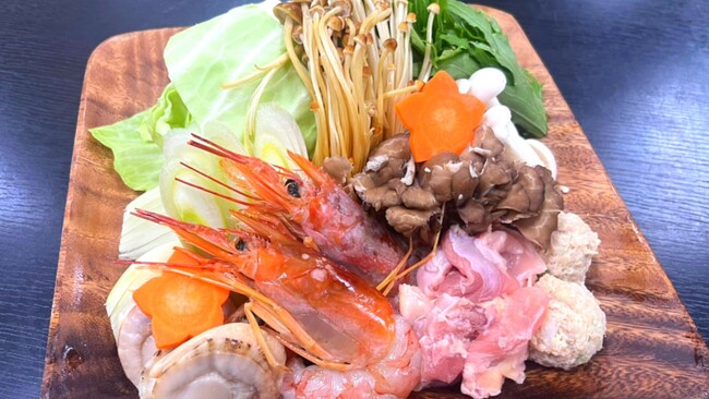 お鍋の内容は、地元産の季節のお野菜、きのこ、エビ、ホタテ、鶏、鶏団子、〆はラーメンです。