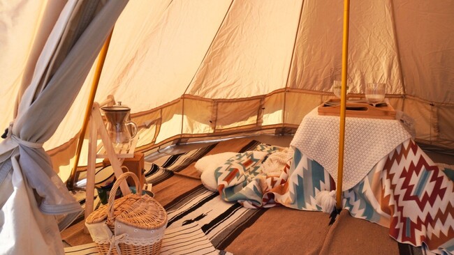最大4名が宿泊できる直径6mのラグジュアリードームテントはスイスアルプスの山岳リゾートや、砂漠地のグランピング施設で採用されており、暑い夏でも寒い冬でも適応できることが実証されています。2重構造の室内はエアコンも完備し、オールシーズン快適にお過ごしいただけます。