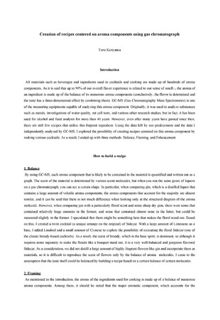 サイトでは上記の解釈を当てはめ制作したカクテルも紹介している。今までは作り手の感覚を頼りに作られてきたレシピが、これによりロジカルな説明をすることが出来る。人は説明され納得することで、その物や経験に価値を感じると言われ、香気成分によるレシピ構築はその点を十二分に活用する形となる。