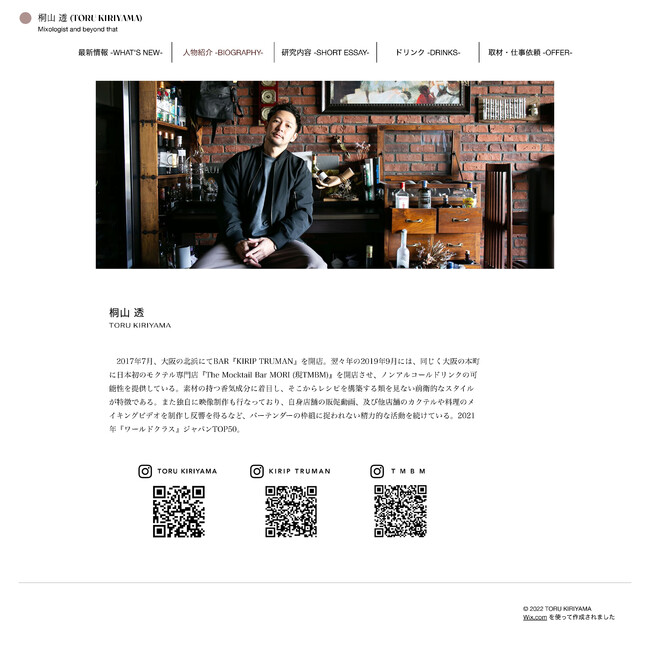 大阪でBAR『KIRIP TRUMAN』、そして日本初のモクテル(ノンアルコールカクテル)専門店である『TMBM(旧名:The Mocktail Bar MORI)』を経営し、スーパーマーケット『ライフ』なんばセントラルスクエア店のモクテルメニュー監修、世界最大のカクテルコンペティション『WORLD CLASS』日本大会TOP50に加え、自他店問わずプロモーション動画の映像制作も単身で手がける等、精力的な活動を続ける桐山透氏。そんな彼がこの度、専門機器を使用した、香りのデータによりレシピを構築するという新たなアプローチ法と共に、自身のWEBサイトを立ち上げた。