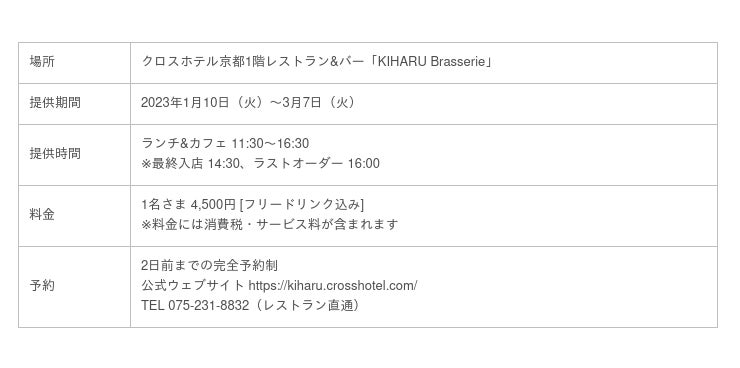 KIHARU Brasserie 公式ウェブサイト:https://kiharu.crosshotel.com/
