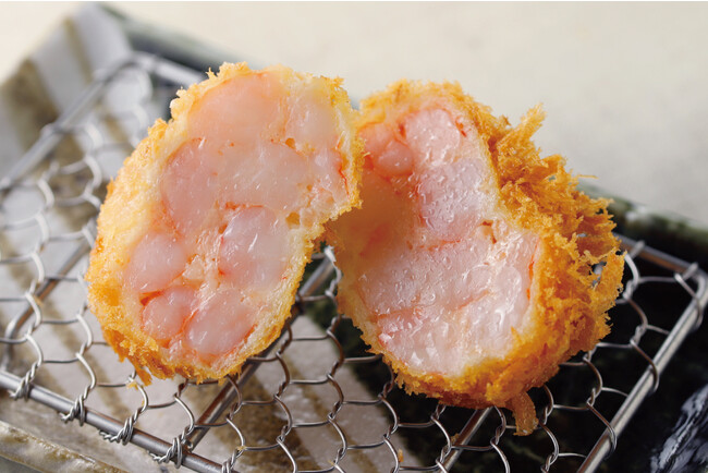 ごろごろと入った海老が口の中でほどけて、豊かな甘みが広がります。海老のすり身をふんだんに使用し、衣を纏ったサクサクのかつの中から、海老の風味が香ります。2種類の海老を使用した、こだわりの海老かつです。