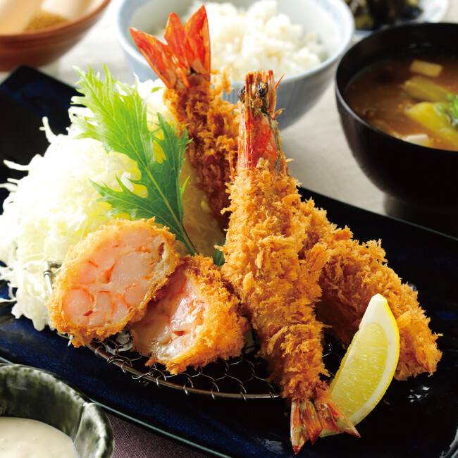 【内 容】天然シータイガーの大海老かつ・有頭車海老かつ・海老しんじょうかつ・キャベツ・ごはん・お味噌汁