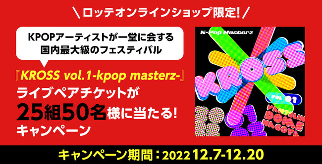 株式会社ロッテ(本社:東京都新宿区)は、2022年12月7日(水)10:00~12月20日(火)23:59の期間、ロッテオンラインショップ限定の『KROSS vol.1-kpop masterz- ライブペアチケットが当たるキャンペーン』を開催いたします。『KROSS vol.1-kpop masterz-』は韓国を中心としたアジアで、世界を眺望し飛躍するアーティストが一堂に会する、日本初、国内最大級のフェスティバルで2023年1月2日(月)バンテリンドーム ナゴヤにて、開催されます。キャンペーン専用特設サイトより、ぜひご応募ください。