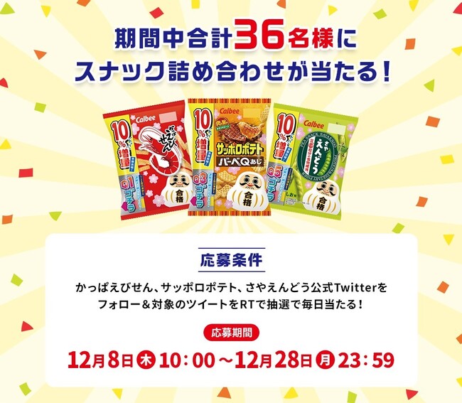 「かっぱえびせん」「サッポロポテト」「さやえんどう」の各公式アカウントをフォロー&該当のツイートをRTした方を対象に、抽選で計36名様に10%(トッパ)増量特別パッケージ『かっぱえびせん』『サッポロポテトバーべQあじ』『さやえんどう しお味』の詰め合わせ(各4袋 計12袋入り)をプレゼントするキャンペーンを実施します。