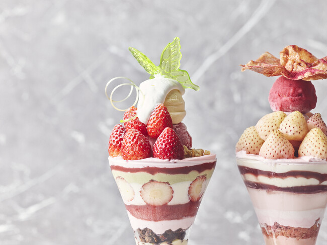 ピスタチオグリーンがアクセントカラーの可愛らしい赤いちごパフェと大人っぽいエレガントな白いちごパフェ、どちらを選ぶか迷うほどのドレッシーな装いです。