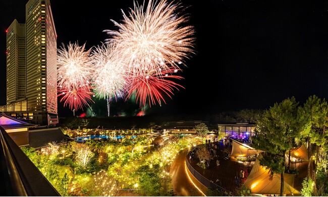 目の前でゆっくりと楽しみたい方は客室から、非日常空間で楽しみたい方はイルミネーションも楽しめる「THE LIVNG GARDEN」から。打ち上げ花火にあわせて流れる音楽と花火の饗宴をお楽しみください。