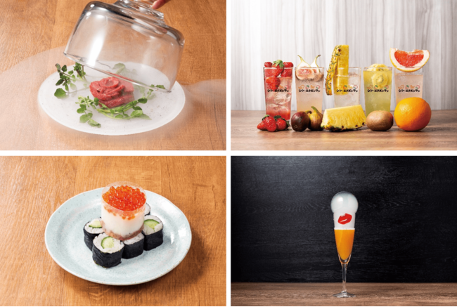 ※(左上)薫る 馬炙り刺し (右上)フレッシュフルーツサワー (左下)なだれるNIKURA (右下)シン・ニクズシマンの薫るカクテル