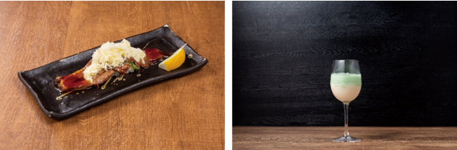 (左)背徳の肉穴子 (右)エスプーマカクテル 大人のメロンソーダ