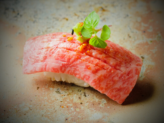 今回当店で提供する「特産松阪牛コース」には、第71回 松阪肉牛共進会にて優秀賞4席(4位)に輝いた「特産松阪牛(津市一志町 前川誠)」を使用しています。特産松阪牛の特徴は、きめの細かいサシが入った見た目と、甘く深みのある上品な香り、そして、まろやかな脂の旨みです。柔らかな肉質は、お箸ですぐに解すことができ、脂肪融点がとても低いため、舌の上に乗せるだけでとろけるような口どけを堪能することができます。肥育農家の方が大切に育て上げた特産松阪牛を、高級食材と組み合わせた渾身のコース料理をご提供いたします。