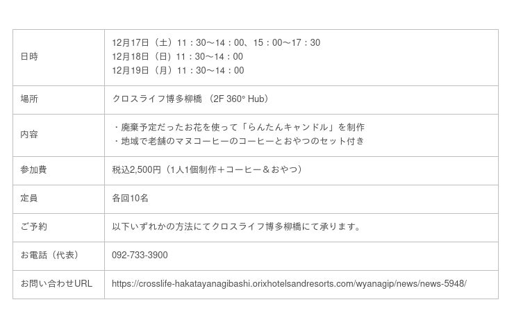 地域とつながり、居心地の良いサードプレイスを提供するクロスライフ博多天神・クロスライフ博多柳橋(所在地:福岡市中央区、総支配人:高橋 信晴)は、年間9億本以上の花が大量廃棄されているフラワーロスの課題に焦点を当て、福岡で廃棄花のアップサイクル(本来は捨てられるはずの廃棄品に新たな価値を与えて再生すること)に取り組んでいるippo アップサイクル(所在地:福岡県久留米市、代表:中西恵)と協同し、「Sustainable Christmas by CROSS Life」をテーマにしたクリスマスイベントを2022年12月17日(土)から開催いたします。廃棄花で作る「らんたんキャンドル」の3日間限定のワークショップ、クリスマスディスプレイやキャンドルナイトなどを催し、サステナブルなクリスマスを体感いただく機会をご提供いたします。