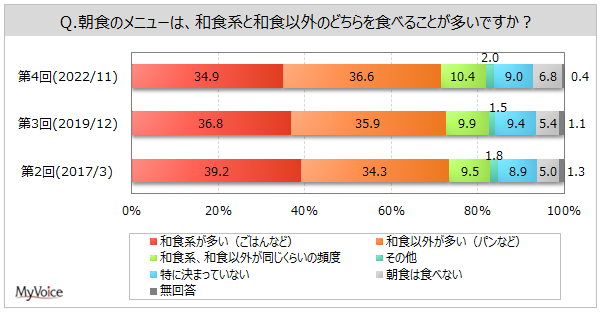 朝食メニューは和食系と和食以外のどちらを食べることが多いかを聞いたところ、「和食系が多い」が34.9%、「和食以外が多い」が36.6%、「和食系、和食以外が同じくらいの頻度」が10.4%です。