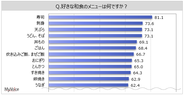 ■好きな和食メニューは「寿司」が8割強、「刺身」「天ぷら」「うどん、そば」が各7割強
