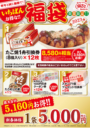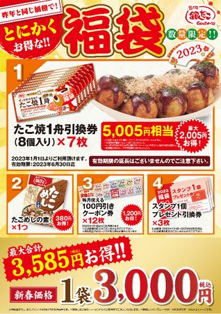 毎年ご好評いただいております、築地銀だこの 『ぜったいお得な!! 福袋』 は、物価高に負けず!今年も同価格の1,000円、3,000円、5,000円(全て税込)の3種類をご用意!
