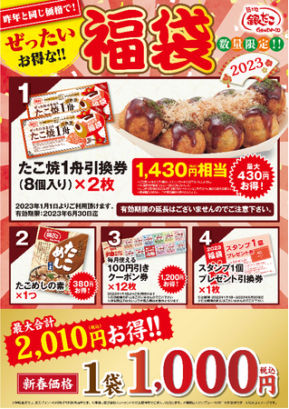 築地銀だこhttps://www.gindaco.com/を展開する株式会社ホットランドhttp://www.hotland.co.jp/(本社:東京都中央区、代表取締役社長:佐瀬守男)は、『ぜったいお得な!! 福袋』 を全国の築地銀だこ店舗(一部店舗を除く)にて、2023年1月1日元旦(一部店舗では先行販売開始)より、数量限定で発売いたします!※施設・店舗により、発売開始日・商品(種類)・方法等が異なります