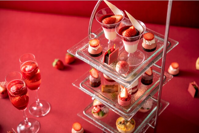 ラウンジ&バー「マリンブルー」では、レッド&ピンクカラーで統一された「いちごとルビーチョコレートのアフタヌーンティー」が初登場。「とちおとめ」や「とちあいか」など選りすぐりのフレッシュな苺を贅沢に使用し、パティシエが一つひとつ作り上げる8種のスイーツをはじめ、美しいビジュアルに心躍る “苺づくし”のアイテムが3段のティースタンドに並びます。パンナコッタやムース、タルトなどの定番アイテムに加え、パフェスタイルにアレンジした苺のショートケーキやスペインの菓子・ポルボロン、ルビーチョコレートを使ったフランス菓子・カヌレなどの新作アイテムも加わりました。