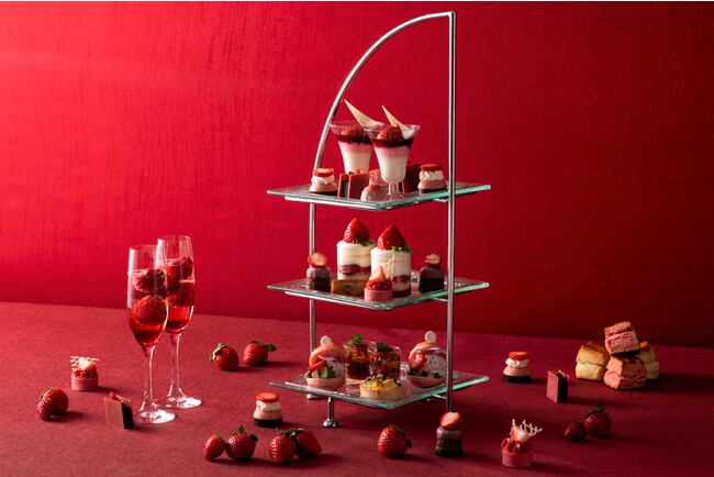 フレッシュな苺をふんだんに使用したビジュアルにも心躍るスイーツが、3段のティースタンドに美しく並びます。苺とスポンジ生地、生クリームが層を成す見た目も愛らしいショートケーキパフェをはじめ、ルビーチョコレートを使ったカヌレやタルトなど、苺の魅力を目と舌で堪能できるアイテムが揃います。