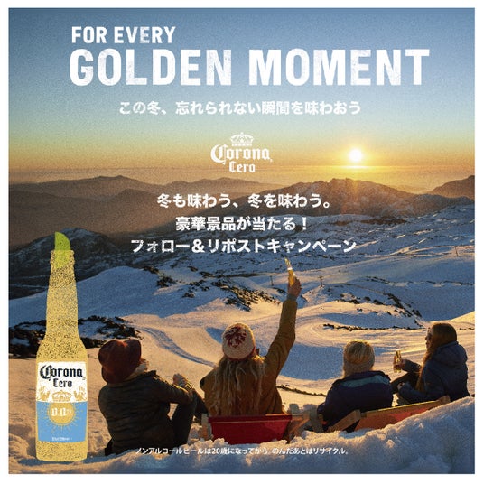 コロナビールは、人生における本質的な豊かさや歓びを大切にし、日々の喧騒から離れ、自然に包まれてリラックスする「ゴールデンモーメント」に寄り添うブランドです。ウィンターキャンペーン「FOR EVERY GOLDEN MOMENT」は、オリンピックを契機にコロナビールが創り出す“忘れられない瞬間”をメッセージの基軸としています。ブランドが象徴する「ビーチライフスタイル」を雪山というフィールドへと拡張することで、場所を問わず“リラックス”と“温もり”を届けていきます。そして、アスリートの栄光の瞬間や、仲間とともにオリンピック観戦を楽しむひとときなど、コロナビールと共にする瞬間はすべてが“ゴールデンモーメント”へと変わる…その体験価値を発信していきます。