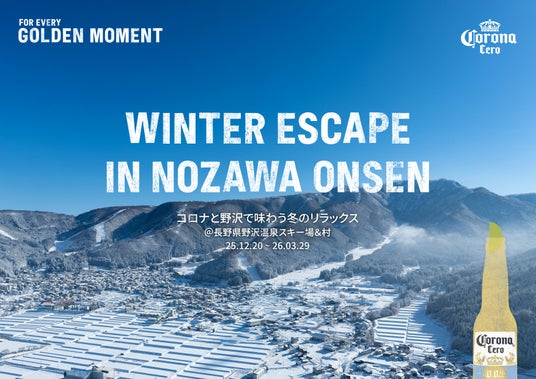 「FOR EVERY GOLDEN MOMENT」キャンペーンの一環として、1998年長野オリンピックの競技会場の一つであり国内外のスキーヤーから支持される長野県・野沢温泉村を舞台に、期間限定イベント「WINTER ESCAPE IN NOZAWA ONSEN」を開催します。野沢温泉村が持つ魅力とコロナビールが提案する「遊び」や「リラックスタイム」が融合し、日常の喧騒から離れ、仲間とともに過ごす、かけがえのない時間をお届けします。