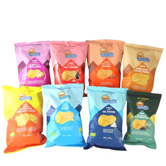 スペイン発のオーガニックチップス「アナヴィエハ」を7種詰め合わせたお得なセットです。お子さまから大人まで、幅広い世代におやつやおつまみとしてお楽しみいただけます。食べ比べて、お気に入りのフレーバーを見つけてください。