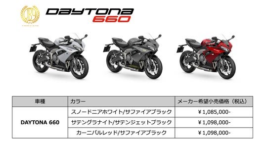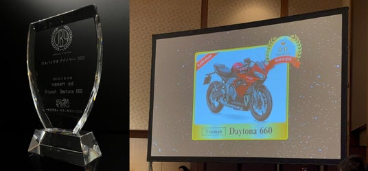 トライアンフモーターサイクルズジャパン株式会社(本社:東京都港区海岸 代表取締役社長:大貫陽介)は、トライアンフのスポーツバイク【DAYTONA 660】が「第8回 日本バイクオブザイヤー2025」で「外国車部門・金賞」を受賞いたしましたことをお伝えします。