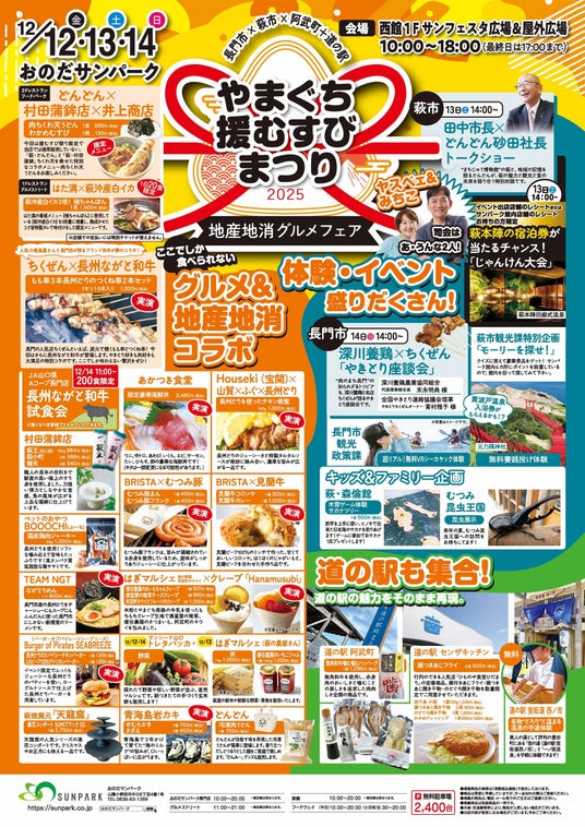 山口県を拠点に展開する富士商グループ(本社:山口県山陽小野田市稲荷町10-23 代表取締役:藤田 敏彦)の小野田商業開発株式会社が運営をおこなう商業施設「おのだサンパーク」と援むすび山口(所在地:山口県下関市)は、2025年12月12日(金)~14日(日)の3日間、山口県の北浦エリア(長門市・萩市・阿武町)をテーマにした大型地産地消イベント「やまぐち援むすびまつり2025<地産地消グルメフェア> 長門市×萩市×阿武町+道の駅」を開催いたします。