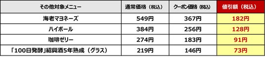 ※店舗により内容・価格が異なる場合がございます(販売していない店舗もございます)定番人気メニューから忘年会シーズンに大活躍のアルコールまで全10品が33%OFF!