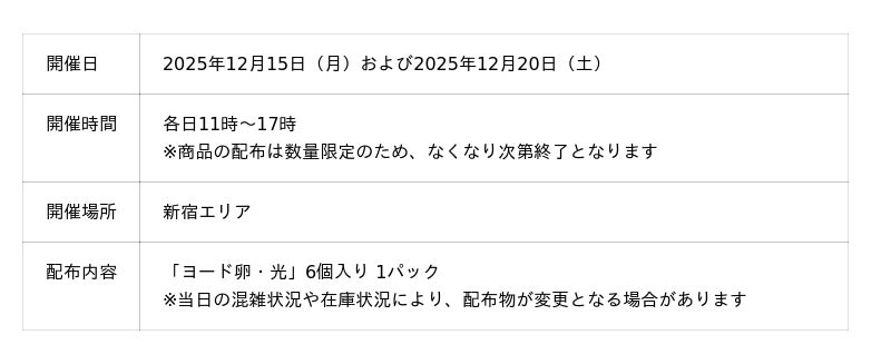 12月15日(月)・20日(土)の2日間、新宿エリアにてサンプリングイベントを実施いたします。「ヨード卵・光」のビジュアルを掲出し、当日配布する金のたまご型の付箋に「今年一年で自分を褒めたいこと」を記載し貼り付けていただいたご参加者に、「ヨード卵・光」を専用手提げ袋に入れてお渡しします。これらの付箋が集まることで、「ヨード卵・光」のビジュアル自体が、一つの大きな「金の卵」に変化していく様子をお楽しみいただけます。