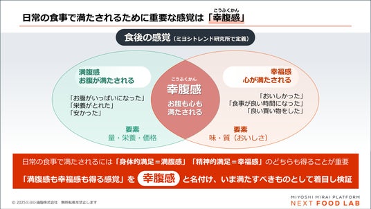 ミヨシトレンド研究所は、独自の消費者調査や購買行動データから、消費者は増加する食料支出に家計を圧迫されているなか、日常の食事を「楽しみの一つ」としていると分析。日常の食事で満たされるには、「身体的満足=満腹感」と「精神的満足=幸福感」のどちらも得ることが重要であり、満腹感も幸福感も得る感覚を「幸腹感」と名付け、2026年に注目すべき要素として着目しました。