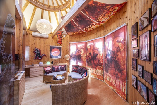 「GRAND CHARIOT 北斗七星135°」の一棟を、日本を代表する特撮映画「ゴジラ」をテーマに装飾。“昭和レトロ”をモチーフに、同作品の世界観と昭和時代が再現された空間を存分に楽しむことができる。