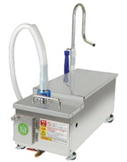 【革新技術1.】新し作業スタイルを実現するリモコン搭載の非接触技術従来の油管理作業では、作業者が高温油(160~180℃)に接近する必要がありました。ECOSAS油濾過機は完全非接触吐出システムを実現。