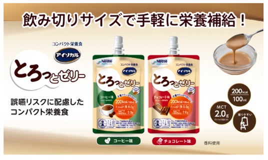 少量で高カロリー(1本100mlあたり200kcal)に、たんぱく質が8.0g入った、片手でも楽に食べられる、スプーンいらずのパウチタイプゼリーです。コーヒー味・チョコレート味※7 のまろやかな2種の味わいで、「えん下困難者用食品 許可基準III」 表示許可も取得しています。ふわふわでとろっとした食感で、さらさらとした液体だとむせやすい方にもおすすめです。